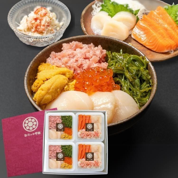 ほたて(三陸産)、サーモン(宮城県産・養殖)、まぐろたたき(キハダ・バチ(太平洋))、ズワイガニ(カナダ産)、めかぶ(宮城県産)、うに(三陸産)、鮭卵(北海道産または三陸産)、植物油脂、醤油、みりん、還元水飴、醸造調味料、食塩、魚介エキス、かつお節エキス、たん白加水分解物/調味料(アミノ酸等)、酒精、ソルビット、酸味料、pH調整剤、酸化防止剤(V.C、V.E)、甘味料(ステビア、トレハロース)(一部に小麦・かに・大豆・さけ・いくら・ゼラチン・さばを含む)