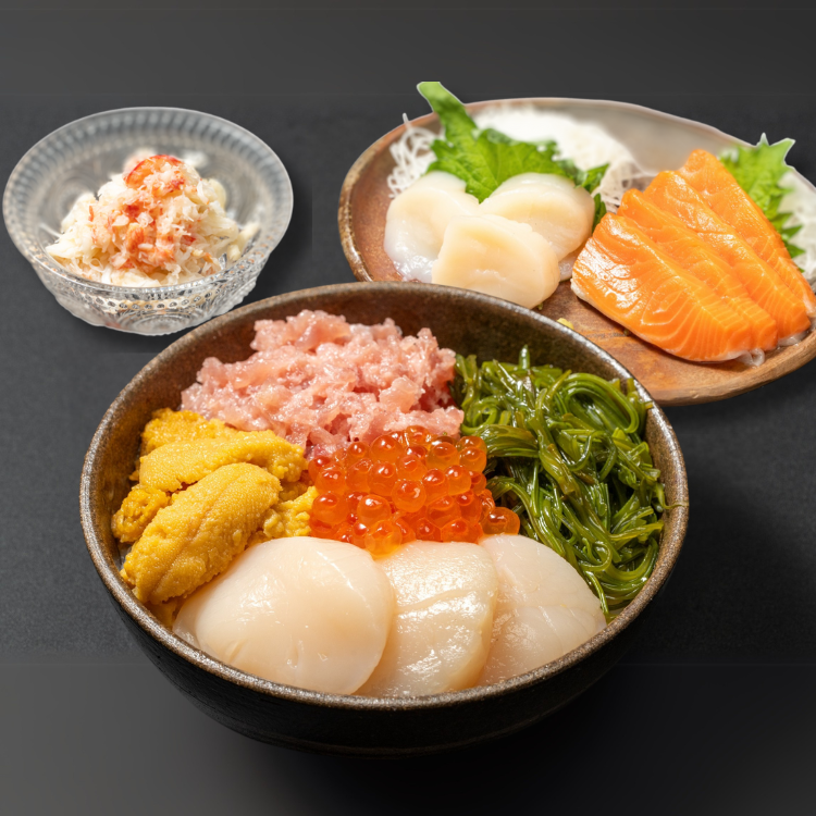 海鮮丼(まぐろたたき/めかぶ/ほたて/うに/いくら)と盛合せ(サーモン/ほたて/ズワイガニ)が楽しめる海鮮丼と盛合せの組み合わせ商品です。