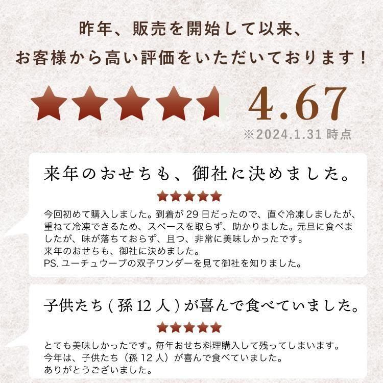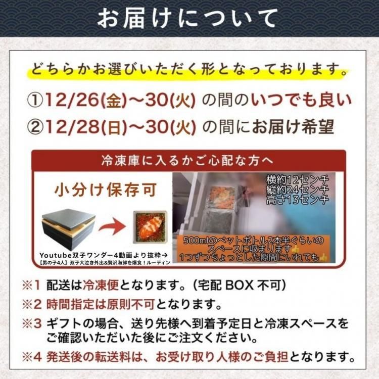 解凍後、食べる食前にフィルムをはがし、重箱にパックごと並べてお召し上がりいただくか、