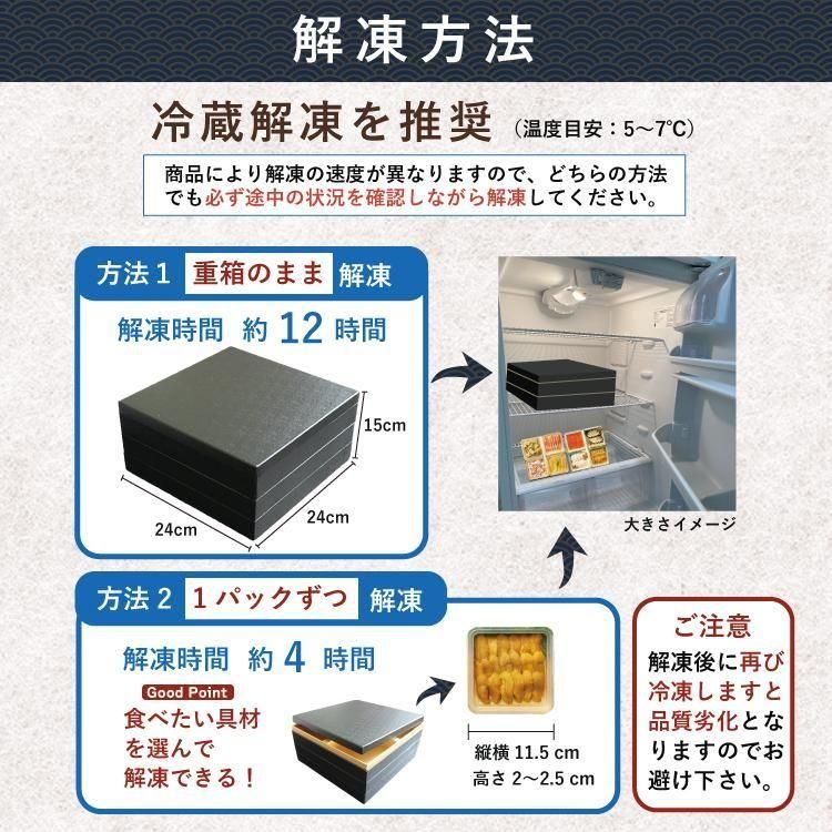解凍方法1:重箱のまま解凍する場合、冷蔵で12時間以上